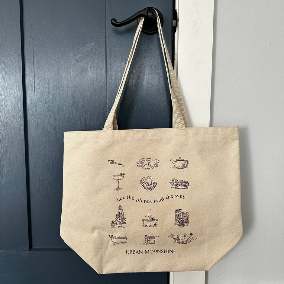 Beautiful large organic cotton tote with custom herbal lifestyle illustrations