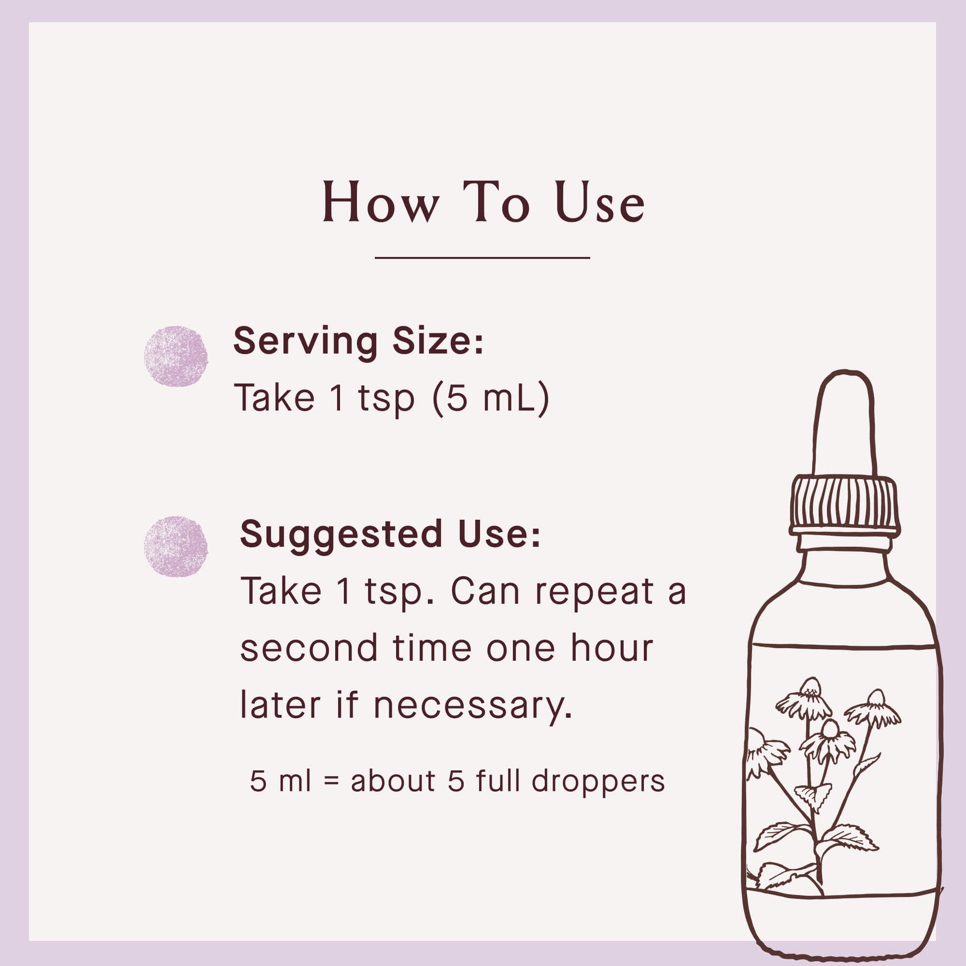 Suggested use: 5 ml (1 tsp). Can repeat a second time one hour later if necessary. Not to be used during pregnancy, breastfeeding, or in children under 18.