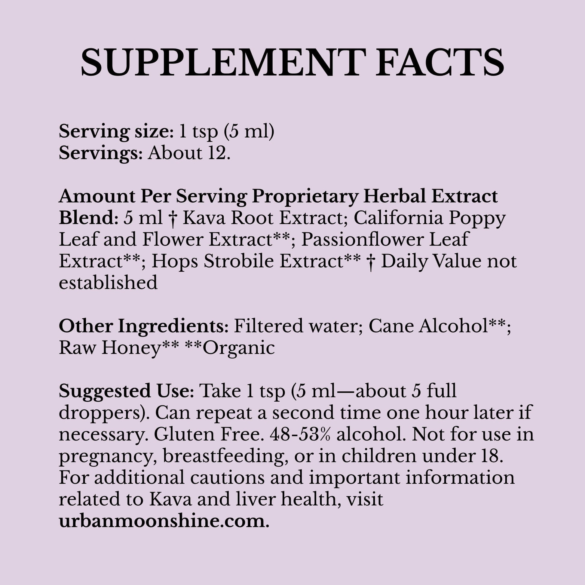 Organic Proprietary Herbal Extract Blend: Kava Root; Organic California Poppy Leaf and Flower; Org. Passionflower Leaf; Org. Hops Flower.