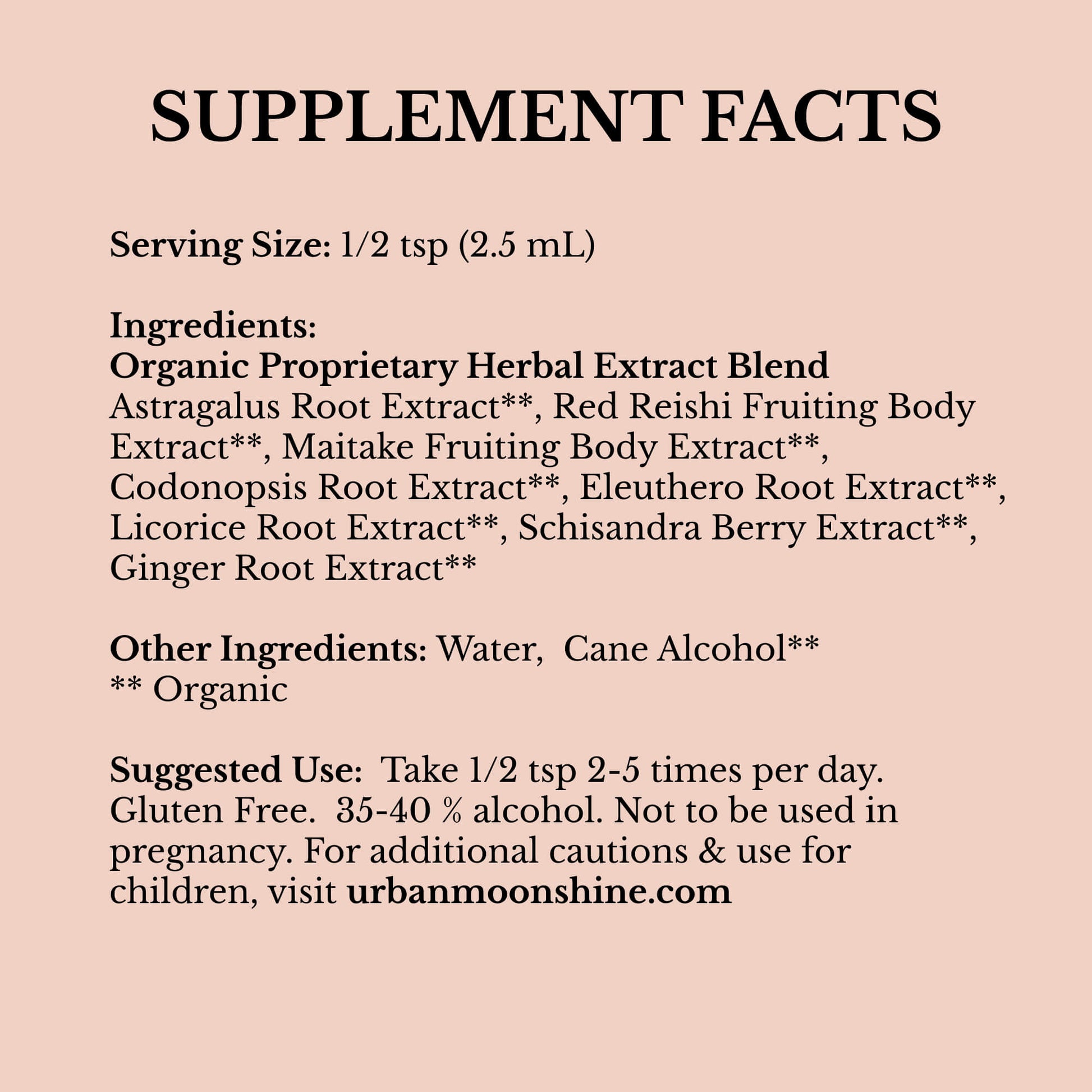 Organic Proprietary Herbal Extract Blend: Organic Astragalus Root; Org. Red Reishi Fruiting Body; Org. Maitake Fruiting Body; Org. Codonopsis Root; Org. Eleuthero Root; Org. Licorice Root; Org. Schisandra Berry; Org. Ginger Root.