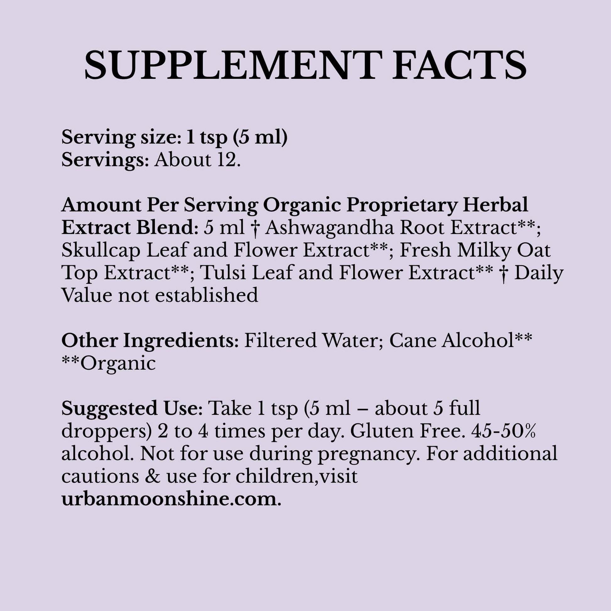 Organic Proprietary Herbal Extract Blend: Organic Ashwagandha Root; Org. Skullcap Leaf and Flower; Org. Fresh Milky Oat Top; Org. Tulsi Leaf and Flower.
